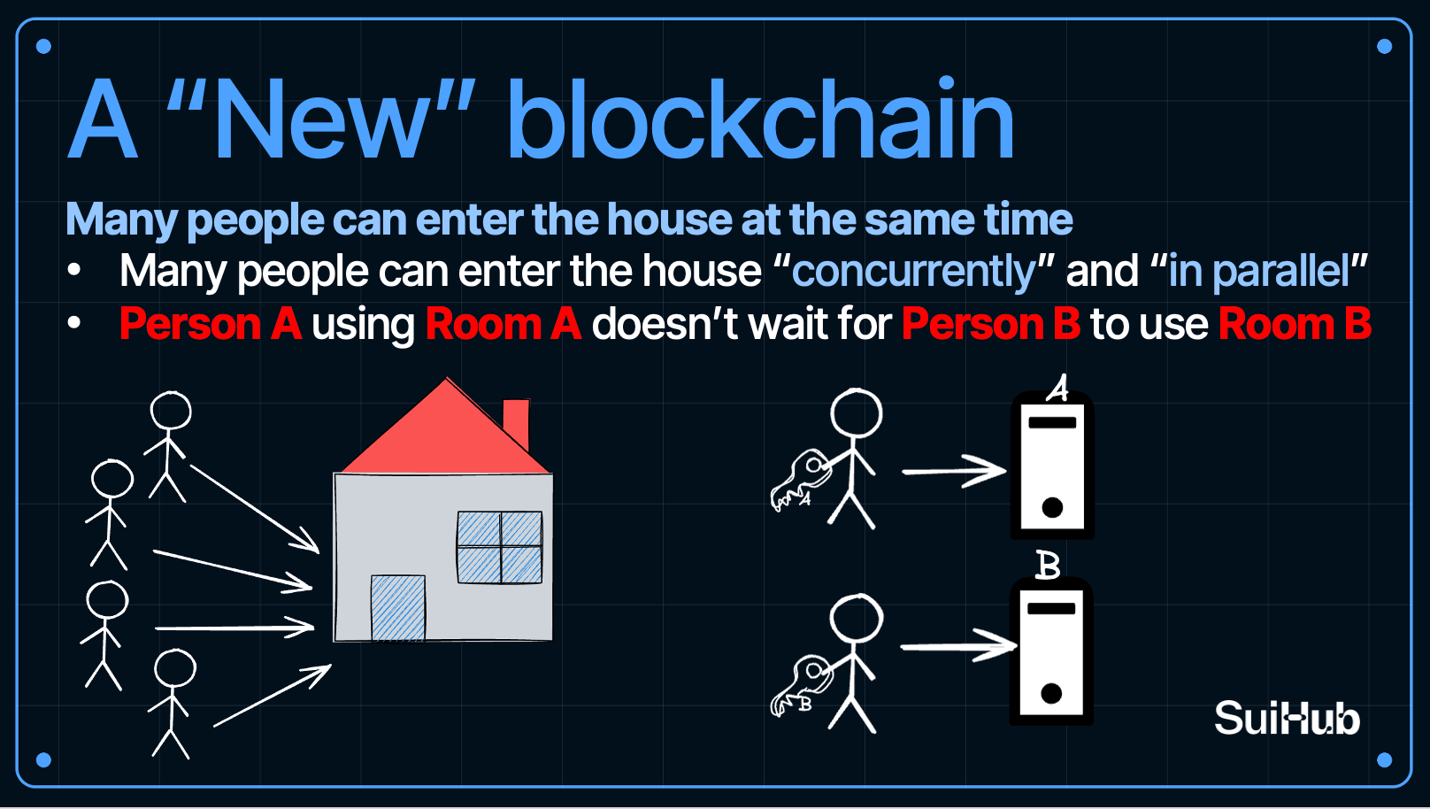 Nhưng giờ thử nghĩ về một cách tiếp cận mới là một “ngôi nhà blockchain” cho phép nhiều người cùng bước vào cùng lúc. Người A sử dụng phòng A, người B sử dụng phòng B song song (in parallel), không ai cần đợi ai: