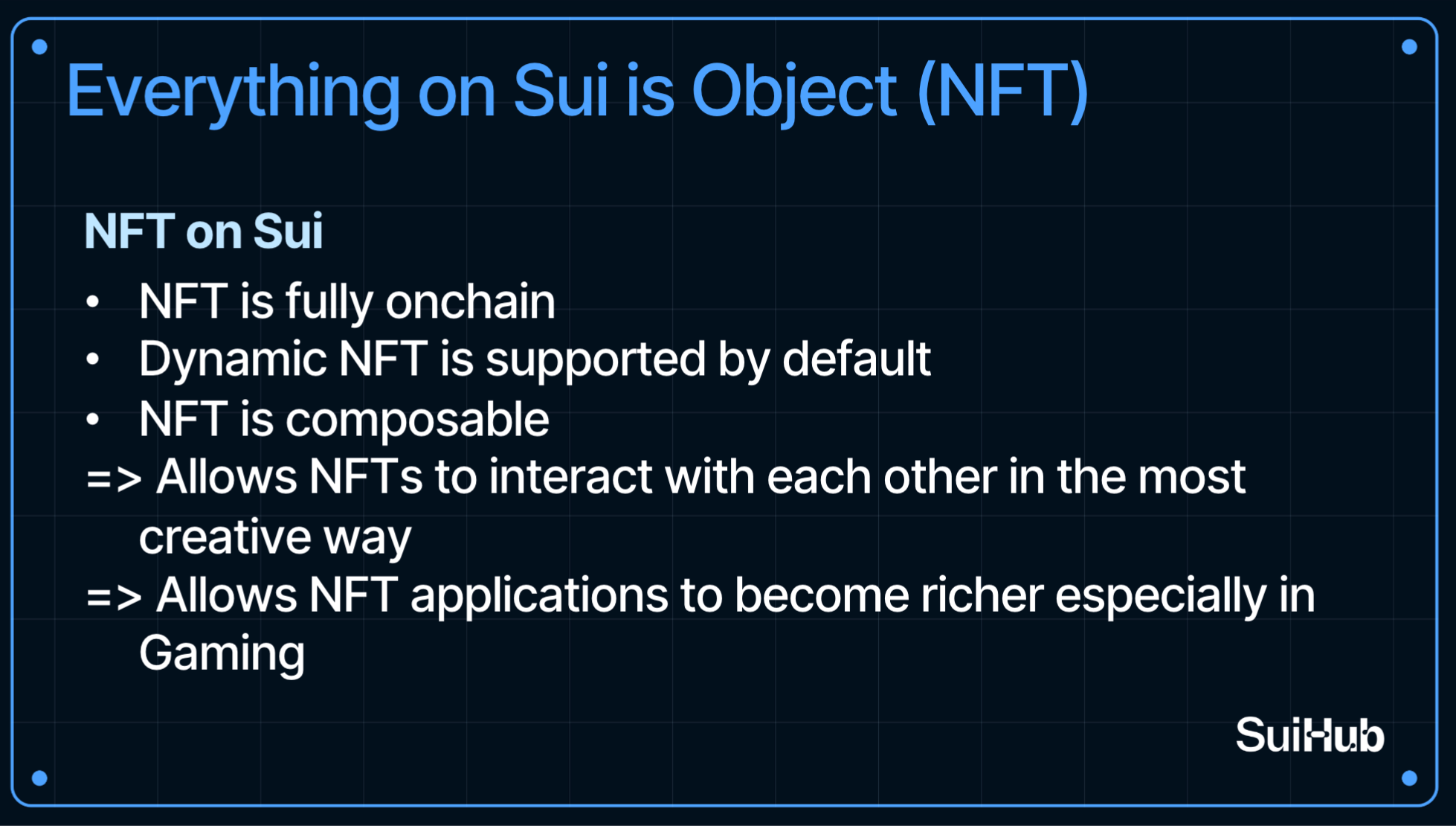 Chính mô hình lấy object làm trung tâm này đã mở ra những tiềm năng đặc biệt là với NFT. Như trong slide trình bày, cách tiếp cận của Sui mang lại những đặc tính vượt trội cho NFT so với các nền tảng khác: