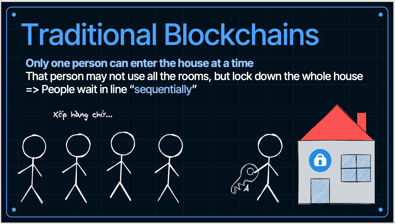 Khi nói về blockchain truyền thống, hãy hình dung một ngôi nhà với nhiều căn phòng. Về lý thuyết, các căn phòng này có thể hoạt động độc lập, nhưng thực tế thì… chỉ một người có thể bước vào nhà tại một thời điểm. Người đó dù chỉ dùng một phòng, nhưng lại khóa toàn bộ căn nhà. Kết quả: tất cả những người khác phải xếp hàng chờ đợi mọi thứ xử lý tuần tự (sequential). Đây chính là vấn đề căn bản của traditional blockchains là throughput thấp, hiệu năng bị giới hạn vì transaction phải chạy nối đuôi nhau.